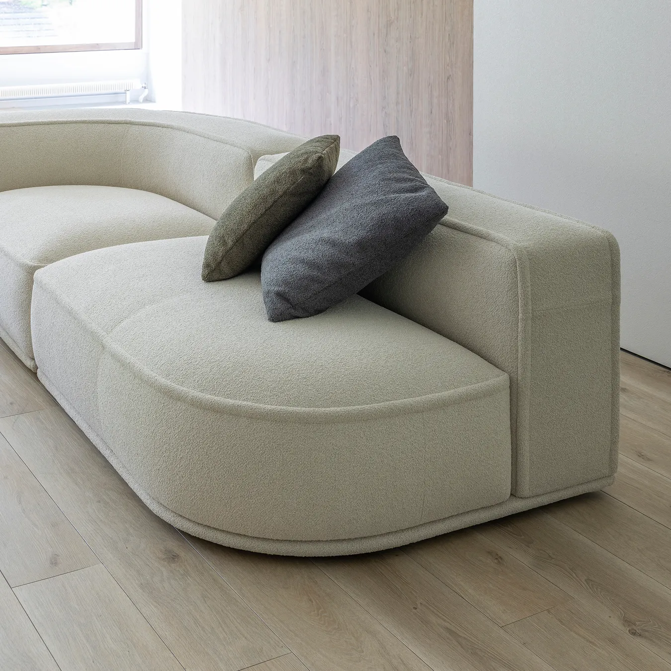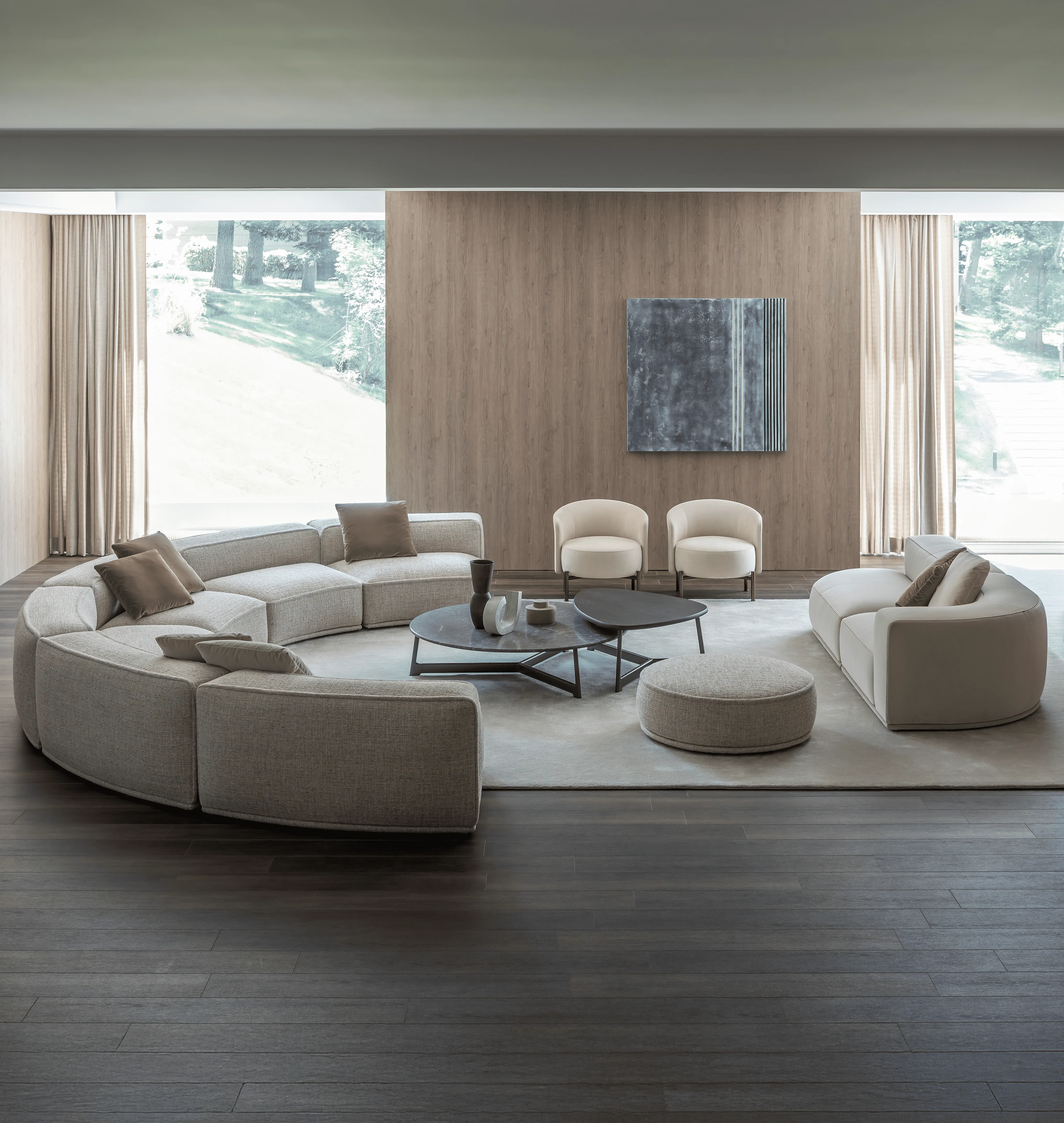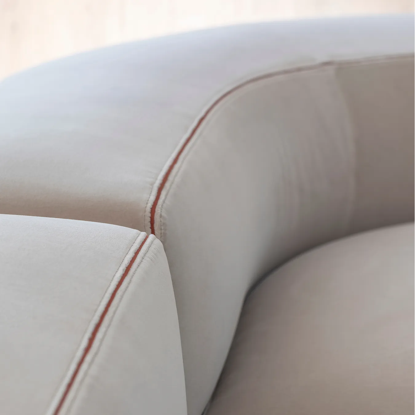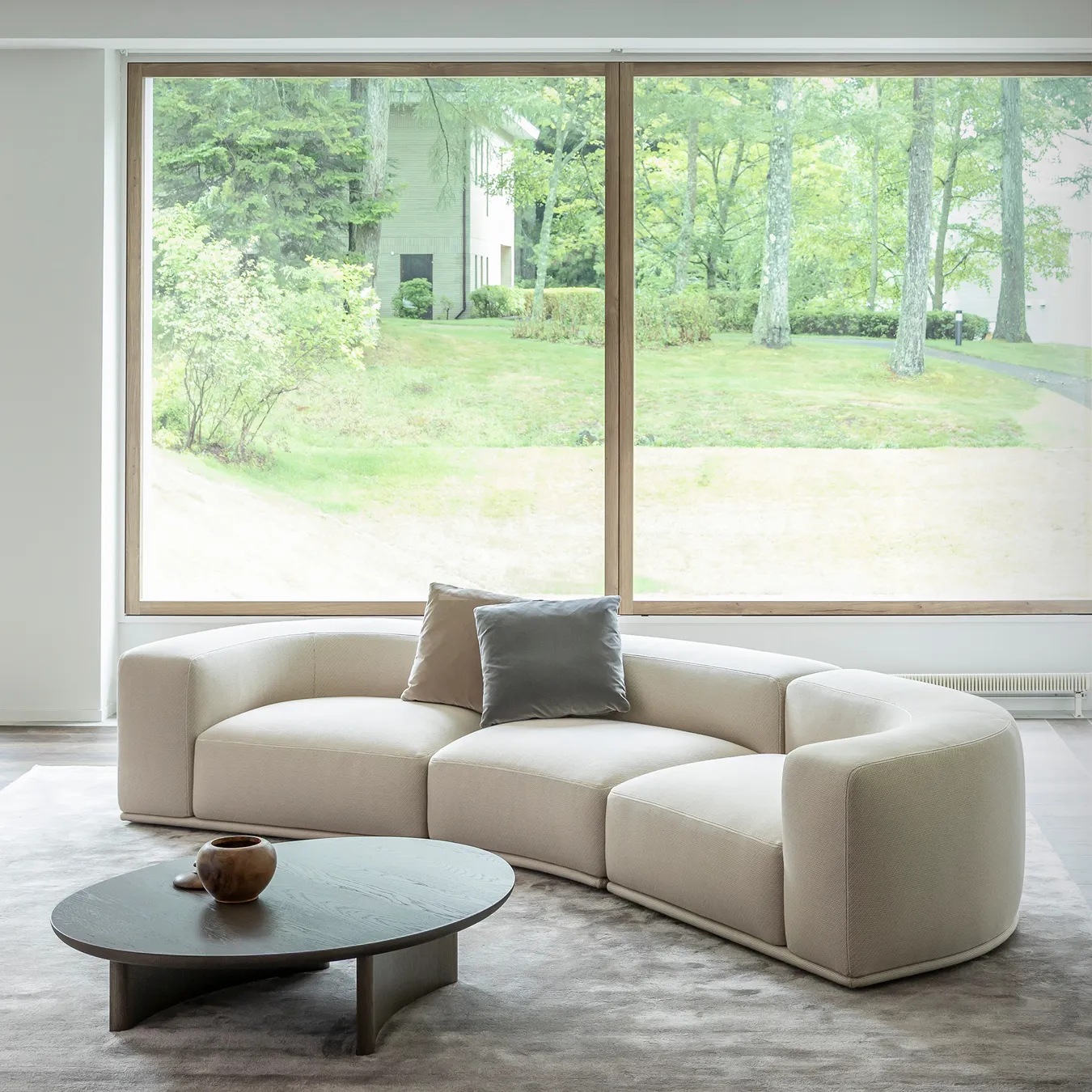 流れるようなカーブを描く、ラウンド型のモジュラーソファ。座る人同士の顔が見渡しやすく、自然な距離感でリラックスしたコミュニケーションが生まれます。4つのユニットを組み合わせることで、どのようなスケールの空間にも自在にフィットします。