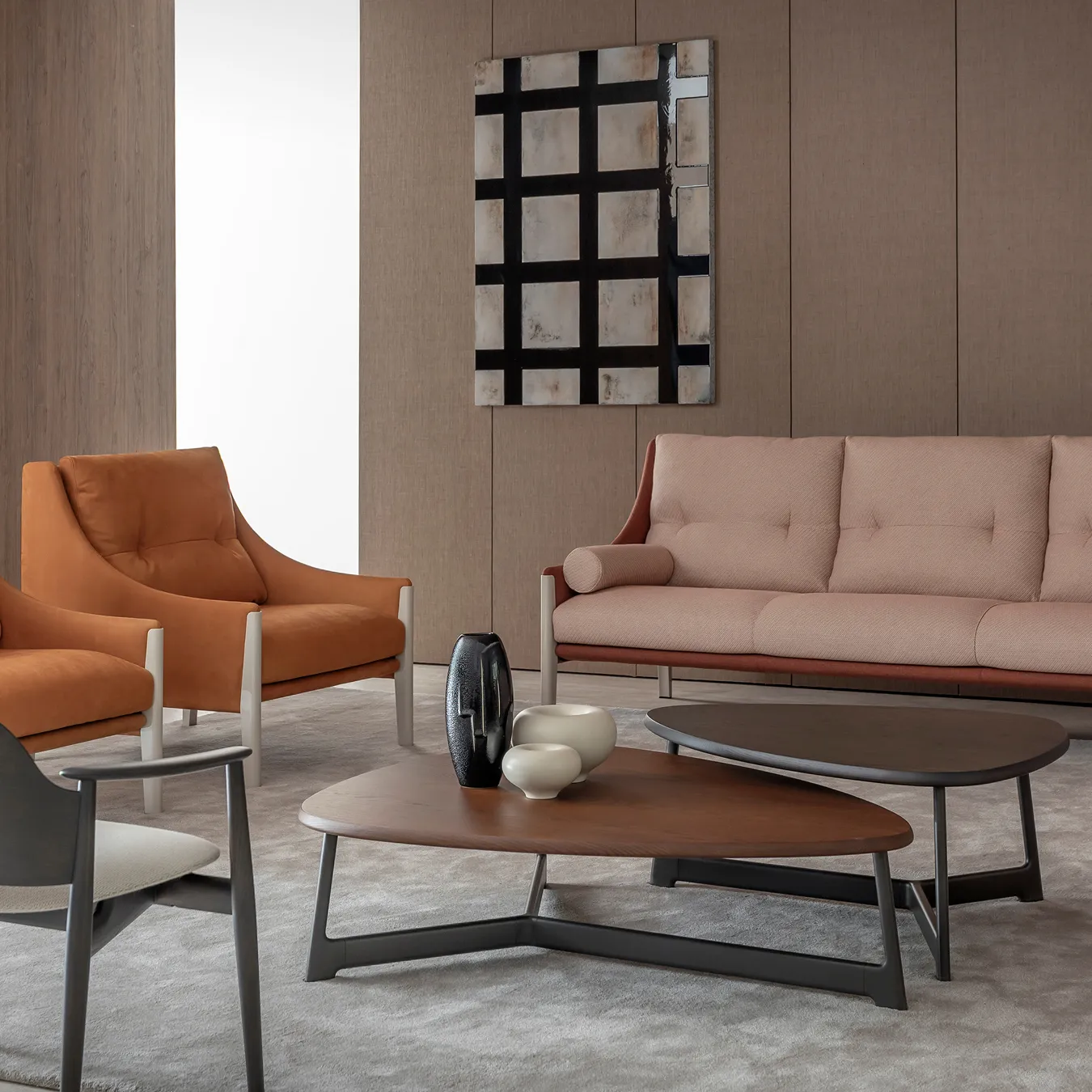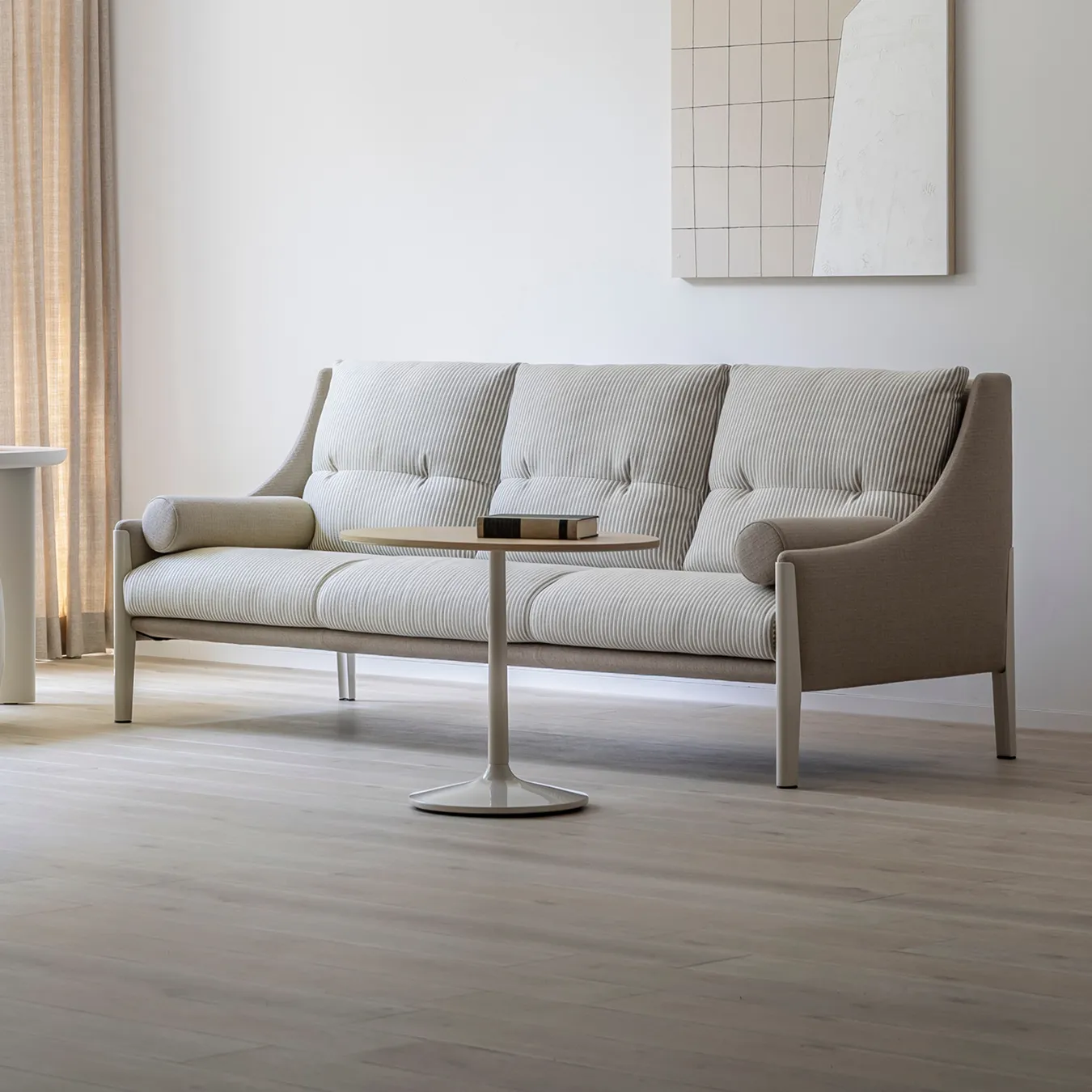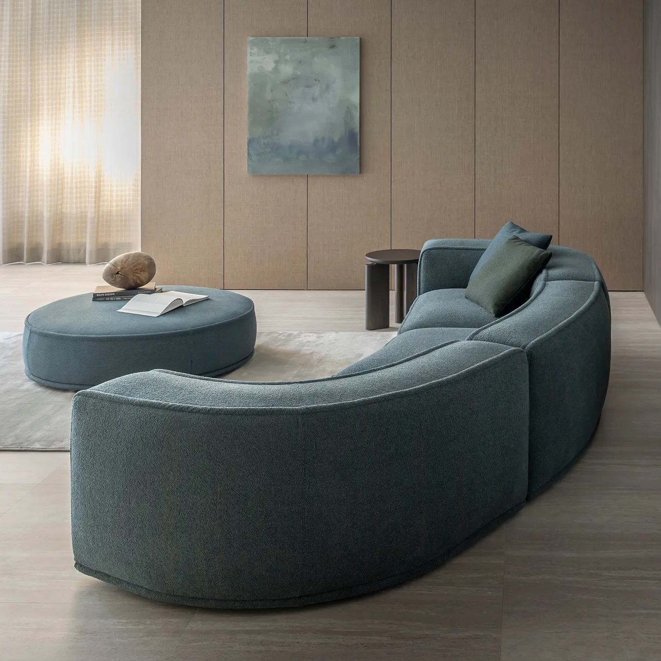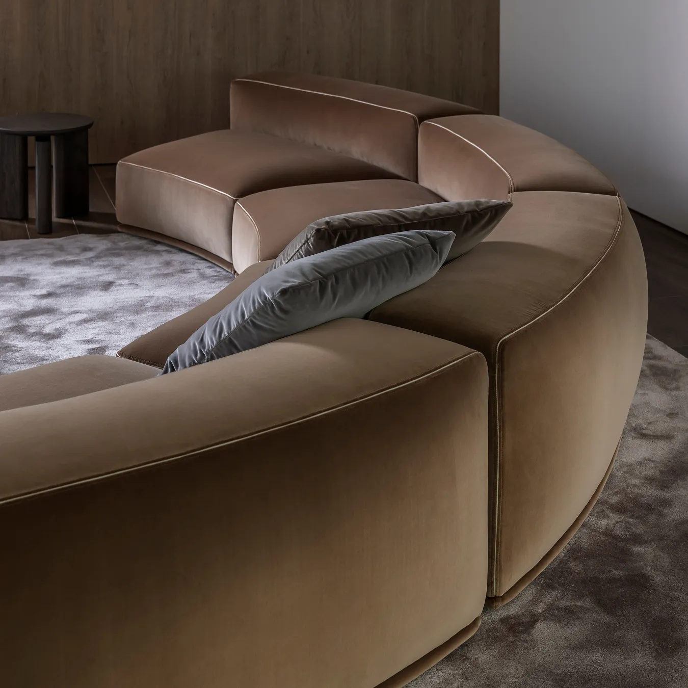 流れるようなカーブを描く、ラウンド型のモジュラーソファ。座る人同士の顔が見渡しやすく、自然な距離感でリラックスしたコミュニケーションが生まれます。4つのユニットを組み合わせることで、どのようなスケールの空間にも自在にフィットします。