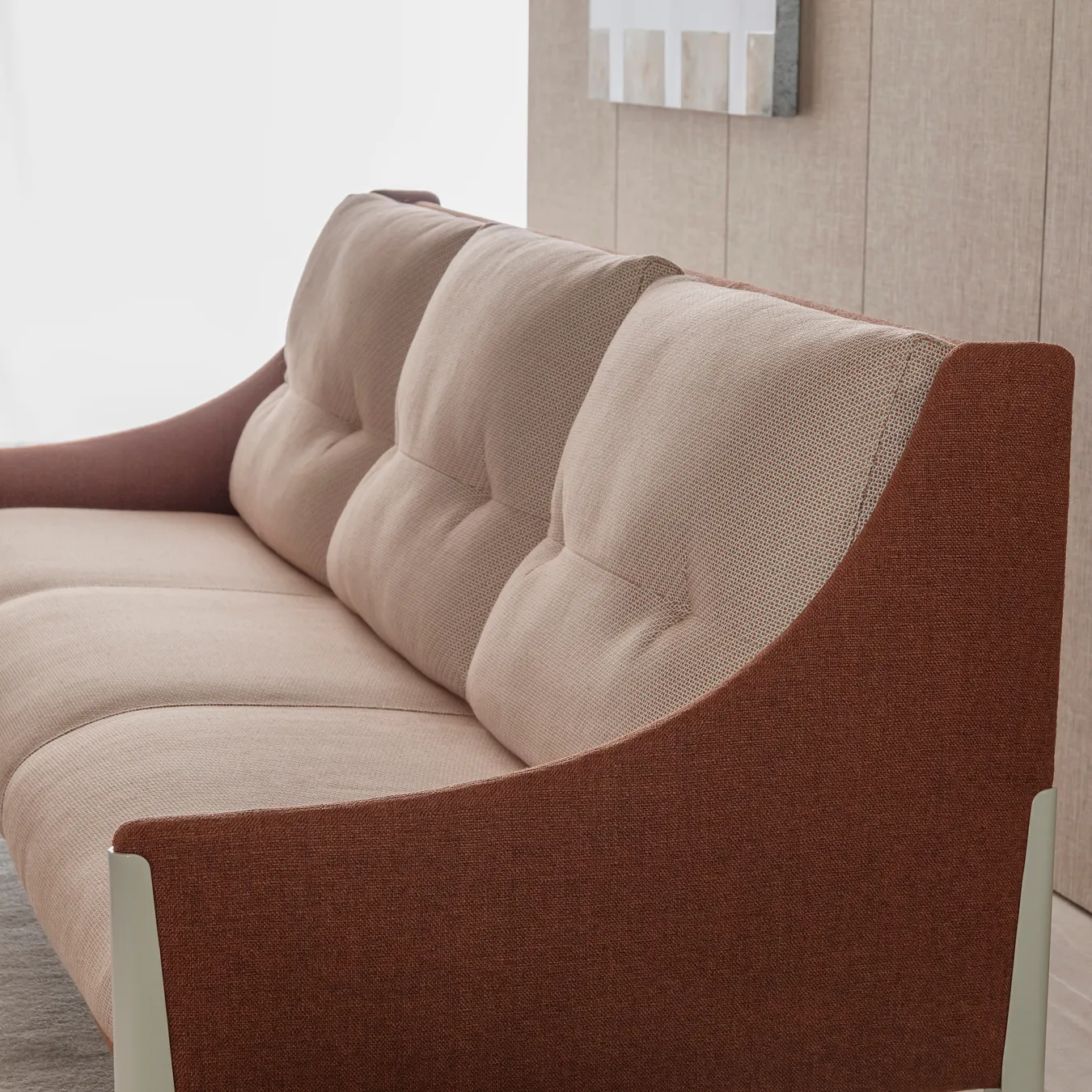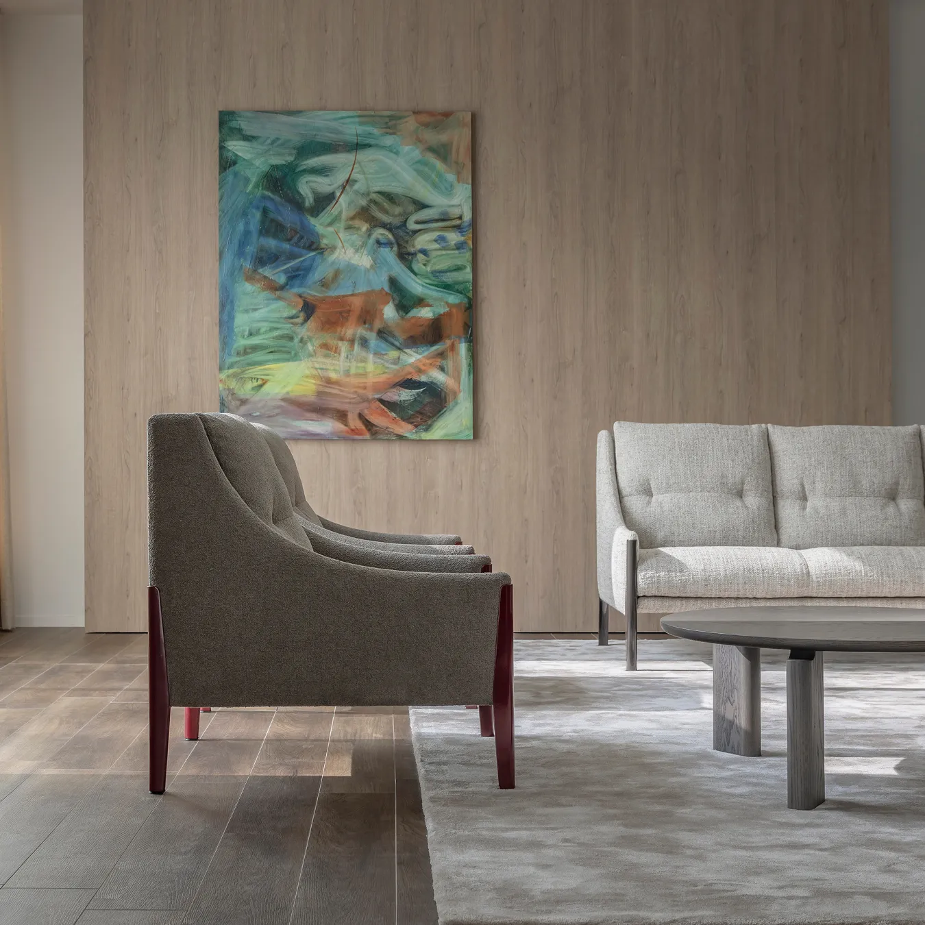 アームから背にかけてなめらかにつながる、優美な曲線。高めのパネルが肩口まで心地よく支え、自然と背筋の伸びるような座り心地です。繊細なディテールが醸し出すクラシカルなムードに、硬質な脚部がモダンな感覚を与えています。