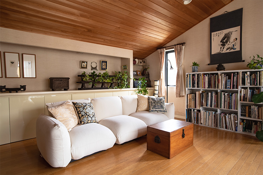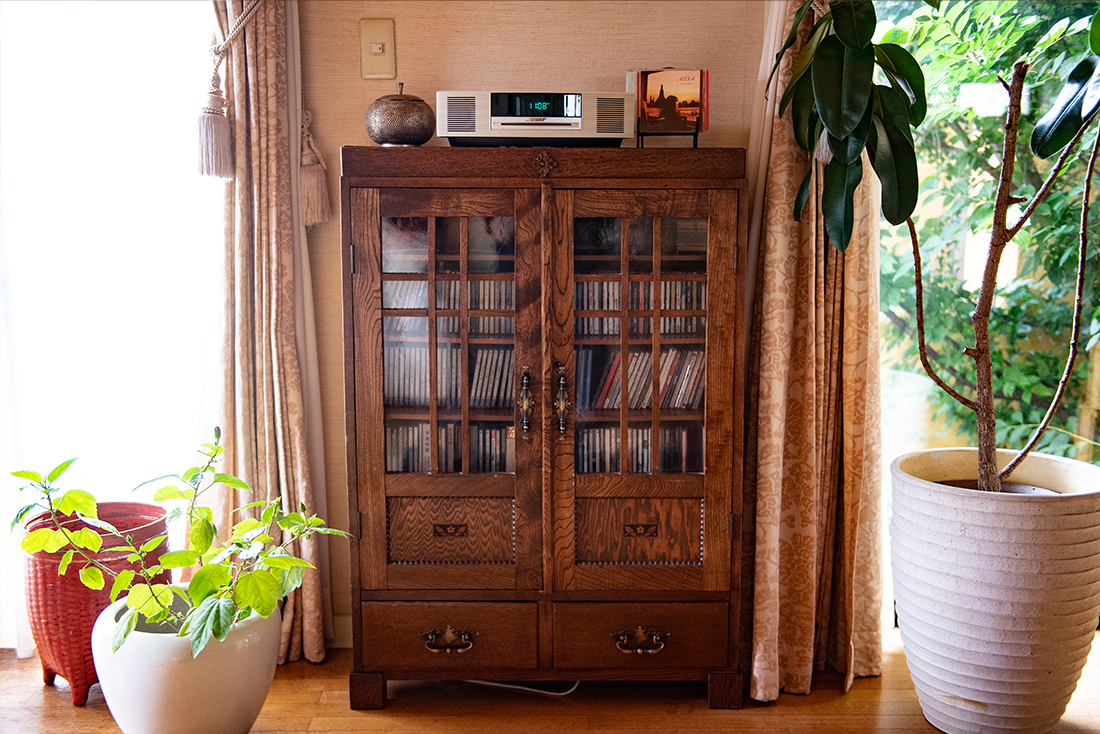 リビングルームの一角に置かれたCD棚は、お父様が小学校に上がる時に文机とともにお祖父様から贈られたという、大切な本棚。水越さんはこの本棚の取手を替えたり、CDの高さに合わせて棚板を入れたりして、使いやすいようにアレンジされています。「この家を建てた時に一番考えたのは収納のこと。絶対に散らからない家はどうやったら作れるかをこの家で実験し、それをお客様にも見ていただこうと思ったのです」という水越さん。マレンコの前に置かれたミャンマーの木箱の中にも、実は健康グッズが収納されているのだと教えてくださいました。