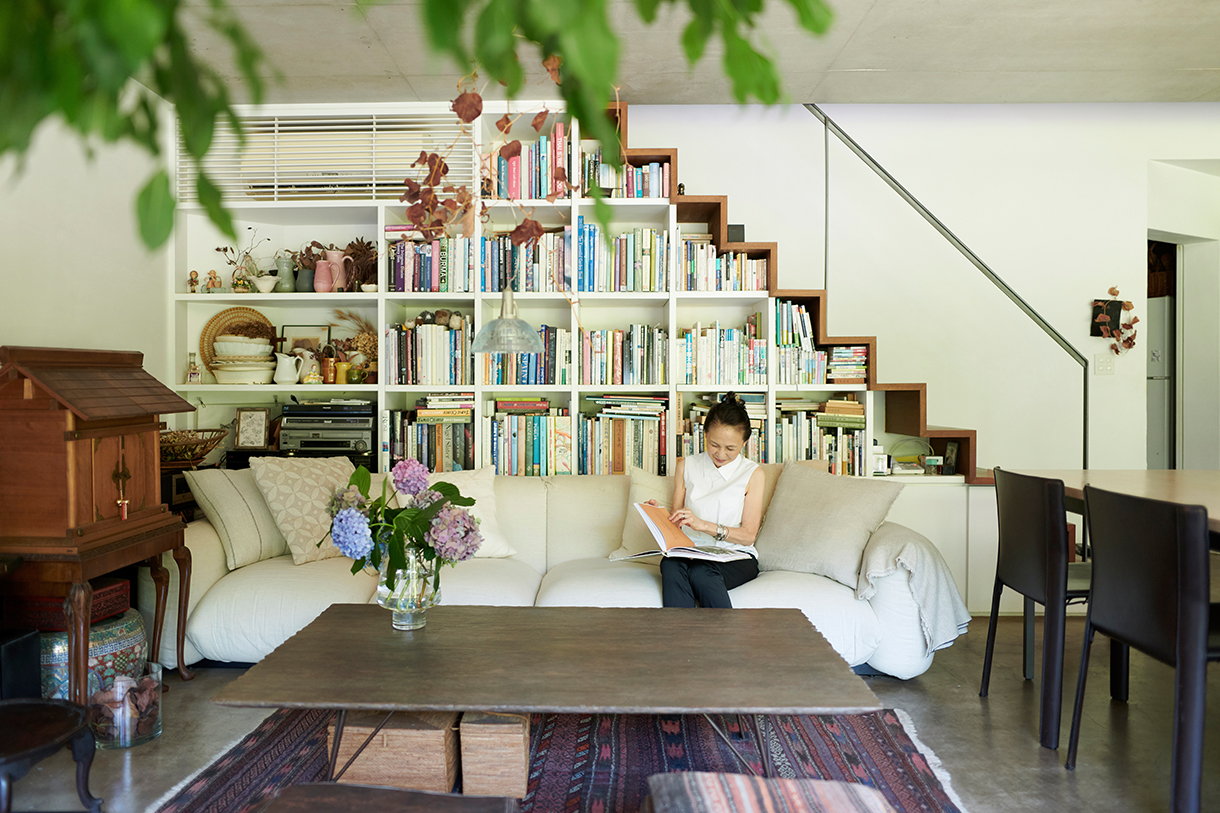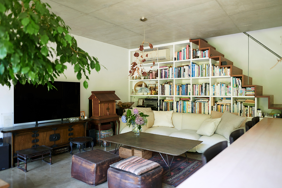 階段下を生かした本棚も印象的なこの部屋には、山本さんのインテリアのこだわりが随所に見られます。「リビングテーブルの手前に並ぶプフはモロッコで作ってもらったもの。テレビ台にしているのは、以前から気に入って持っていた李朝の棚です」と山本さん。庭のサンキライをドライフラワーにしたものをペンダント照明と一緒に飾るなど、ディスプレイにもセンスが光ります。生成色のマレンコのカバーに合わせて、クッションには白やベージュなどの同系色をチョイス。「いろいろなカバーがあるから楽しもうと思うのですが、やっぱり生成色が今は一番落ち着くかな。以前はスタンプ入りカバーも使っていましたね」と山本さん。モダンな建物とさまざまな国からやってきた家具や小物を、柔らかな色がうまく繋いでいるようです。