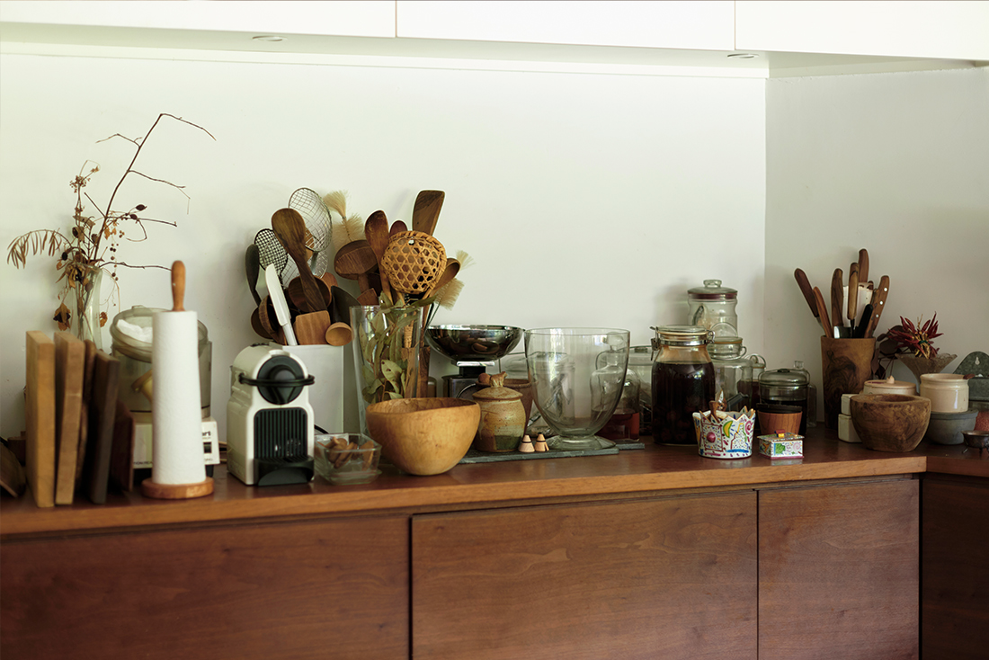 以前は旅行に行くたびに現地の市場などでもの探しをするのが楽しみだったという山本さん。キッチンやリビングには、そんな旅で手にいれられたものが数多くディスプレイされています。「しばらくの間、主人の仕事の関係でインドネシアに住んでいたことがあるんです。その頃は特に、東南アジア各地の市場を訪れては、籠やキッチン道具などの掘り出し物を探していました。いつも手が切れそうなくらいの荷物を持って日本に帰ってきていたものです。今は旅行ができないので残念」とおっしゃる山本さん。とはいえ、お嬢様に言わせれば「ものが多すぎ」だそう。「食器も12客でセットにしているものを半分にしようと思ってはいるのですが、なかなか難しくて。娘に持っていっていいわよと言っているのですが、いつも断られてしまいます」と、笑いながら教えてくださいました。